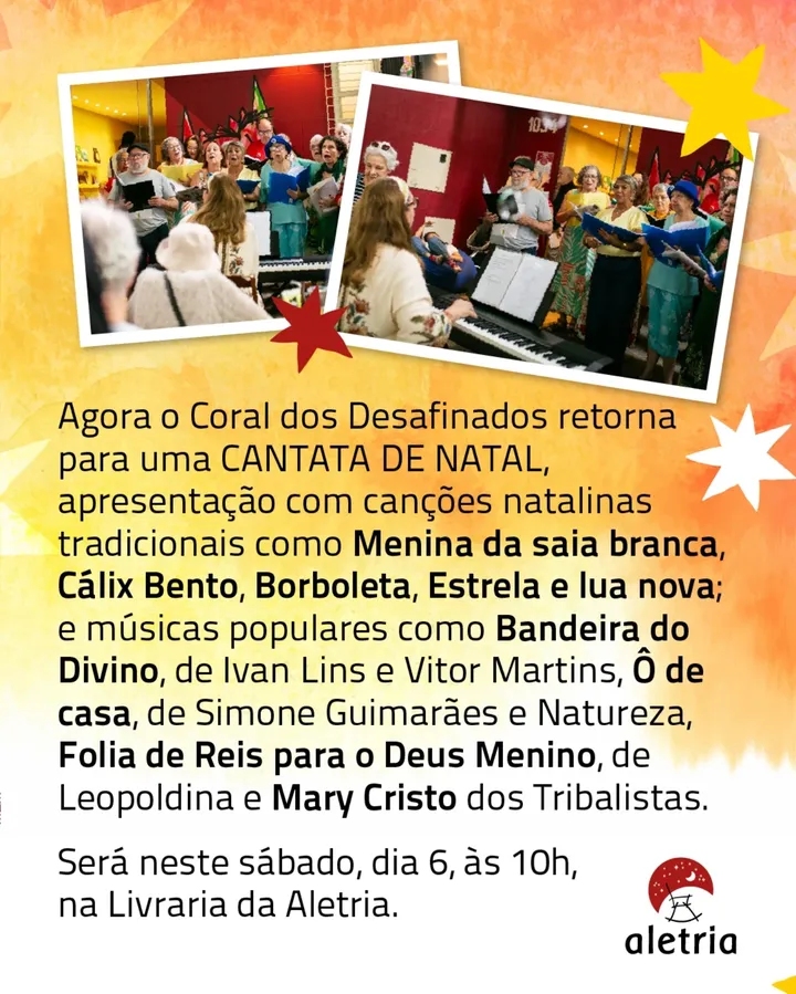 Neste sábado, dia 6, a Livraria da Aletria terá uma apresentação do Coral dos Desafinados, às 10h, na garagem da Livraria, onde há cadeiras e pufs para as pessoas acompanharem sentadas a apresentação. Mais tarde um pouco, às 11h30, no Quintal que fica no fundo da livraria, acontece uma oficina infantil de produção de cartões de Natal e cartinhas para o Papai Noel, com a psicopedagoga Ariane Lima.