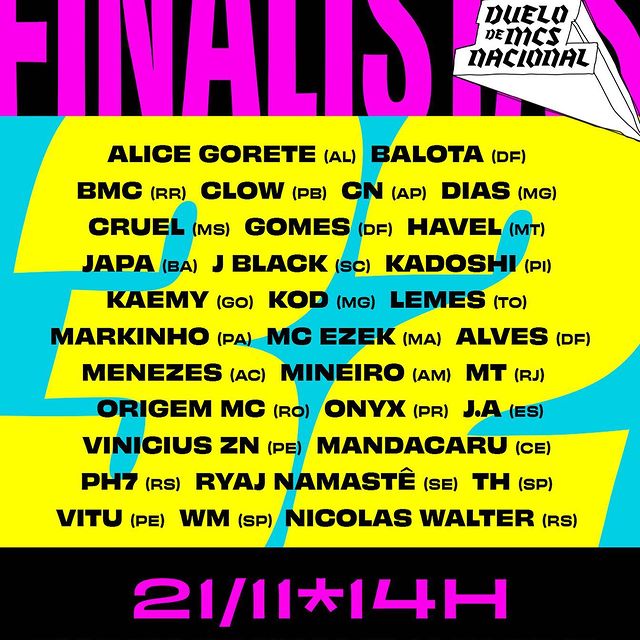 No dia 21 de novembro de 2021, quase um ano após o esperado, o público finalmente saberá quem vai levar o título de campeã ou de campeão do Duelo de MCs Nacional 2020. 32 MCs, classificades nas seletivas estaduais e na repescagem ao longo do ano passado, sobem ao palco em Belo Horizonte para disputar a final da maior batalha de rimas improvisadas do Brasil.
