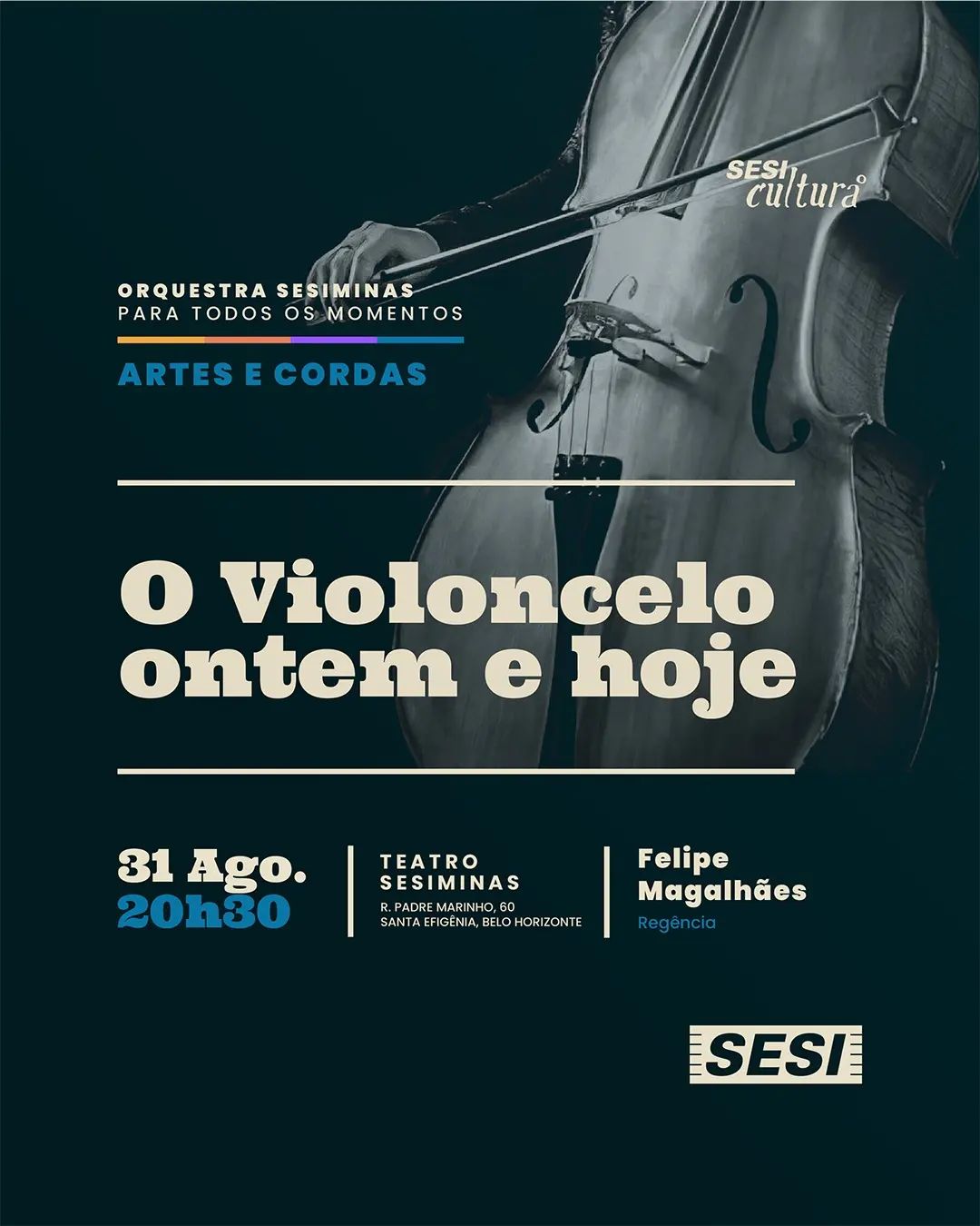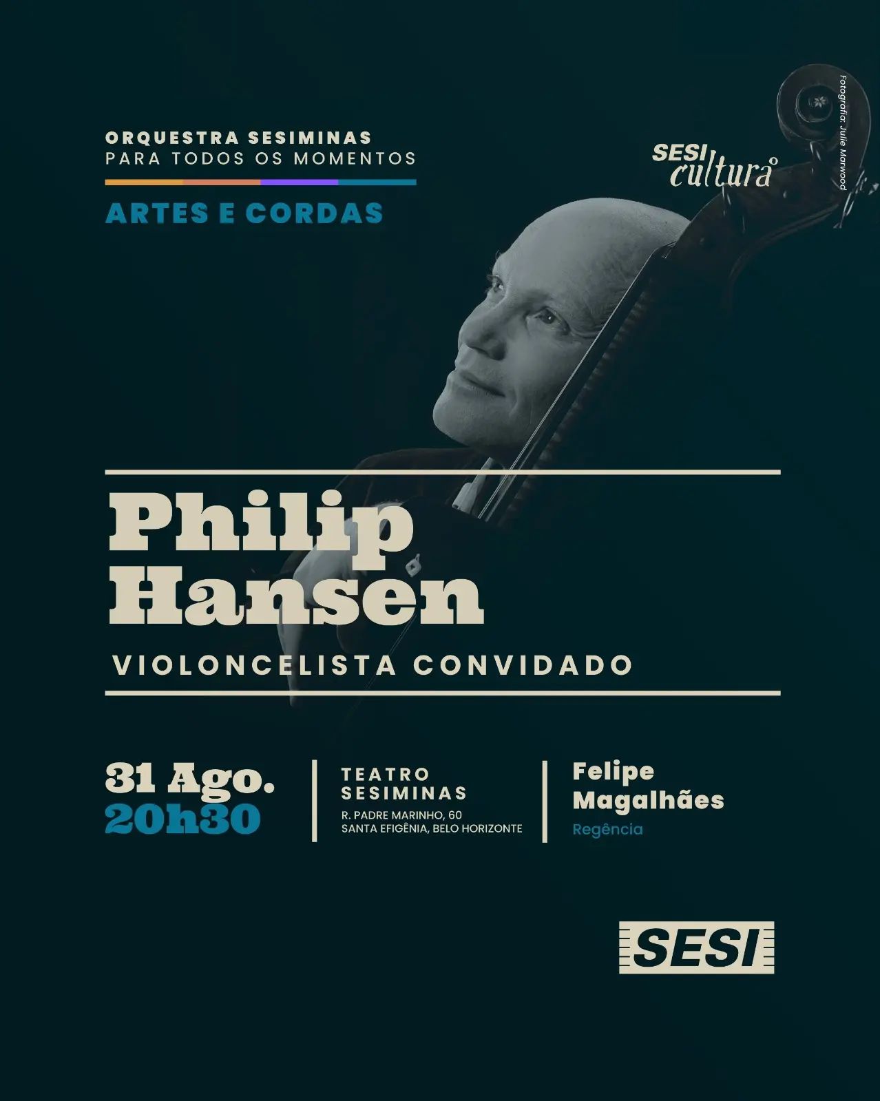 A Orquestra SESIMINAS convida o violoncelista Philip Hansen para o espetáculo "O Violoncelo Ontem e Hoje", que integra a série Artes e Cordas.
