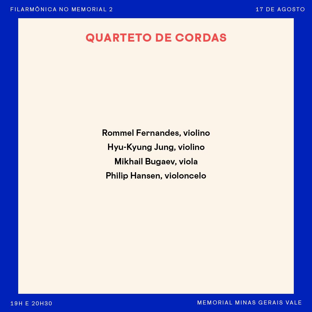 Desta vez, a apresentação será do Quarteto de Cordas em duas sessões, às 19h e às 20h30. Os musicistas irão interpretar “Três peças para Quarteto de Cordas”, de Stravinsky, o “Quarteto de Cordas nº 1”, de Bartók, e o “Quarteto de Cordas nº 1 em fá sustenido menor”, de Lorenzo Fernandez.