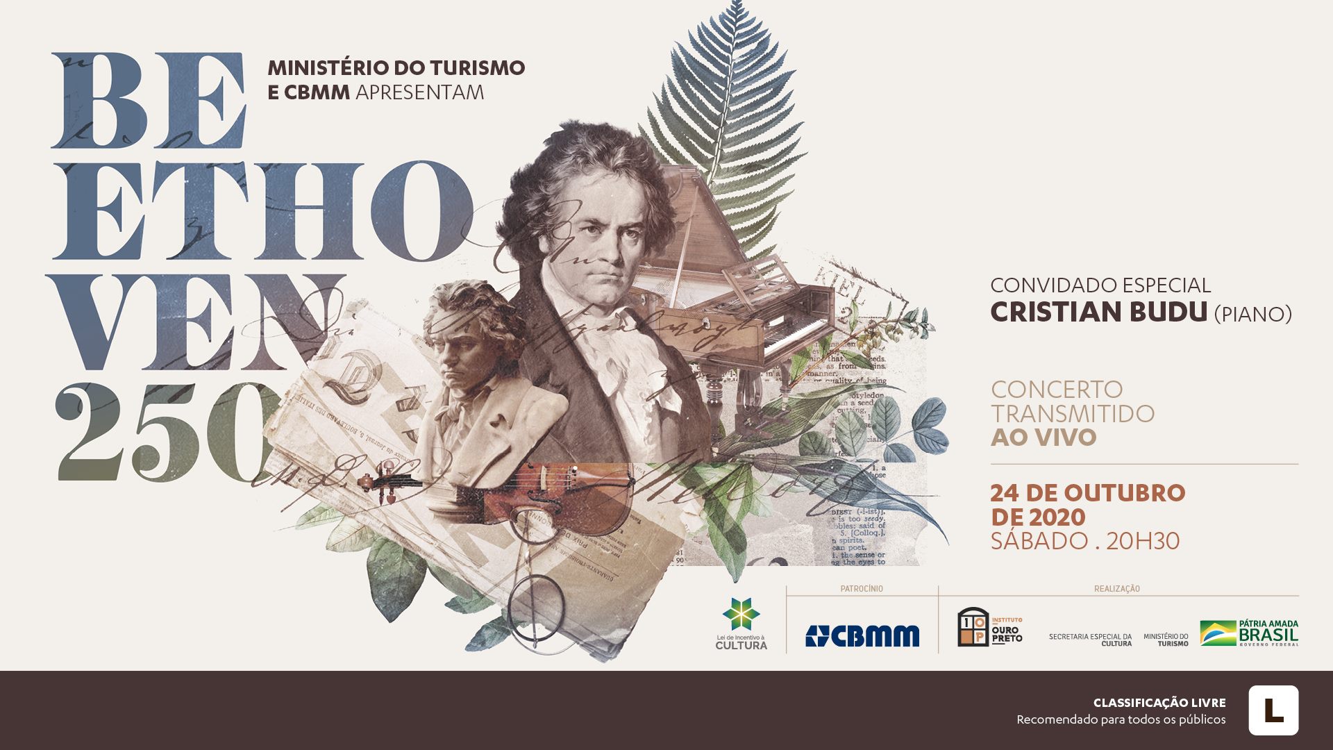 Com regência do Maestro Rodrigo Toffolo e patrocinado pela CBMM, o repertório traz duas peças representativas da grandiosidade do compositor alemão em um concerto de aproximadamente 60 minutos. A célebre “Sonata ao luar” para Piano Solo é um dos temas mais conhecidos do compositor, sendo inclusive utilizado em inúmeras obras cinematográficas. Já o Concerto nº 5 para Piano e Orquestra, popularmente conhecido como “Imperador”, será apresentado em uma composição especial para a ocasião.