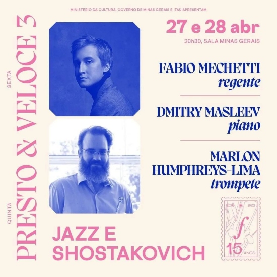 Nos dias 27 e 28 de abril, a Sala Minas Gerais receberá o pianista russo Dmitry Masleev para interpretar o “Concerto para piano nº 1 em dó menor”, de Shostakovich. O Principal Trompetista, Marlon Humphreys-Lima, também será solista na mesma obra, pois ela foi criada para os dois instrumentos. Em seguida, um dos responsáveis por popularizar o jazz na União Soviética, Alexander Tsfasman, se apresentará com a obra “Jazz Suite para piano e orquestra”.