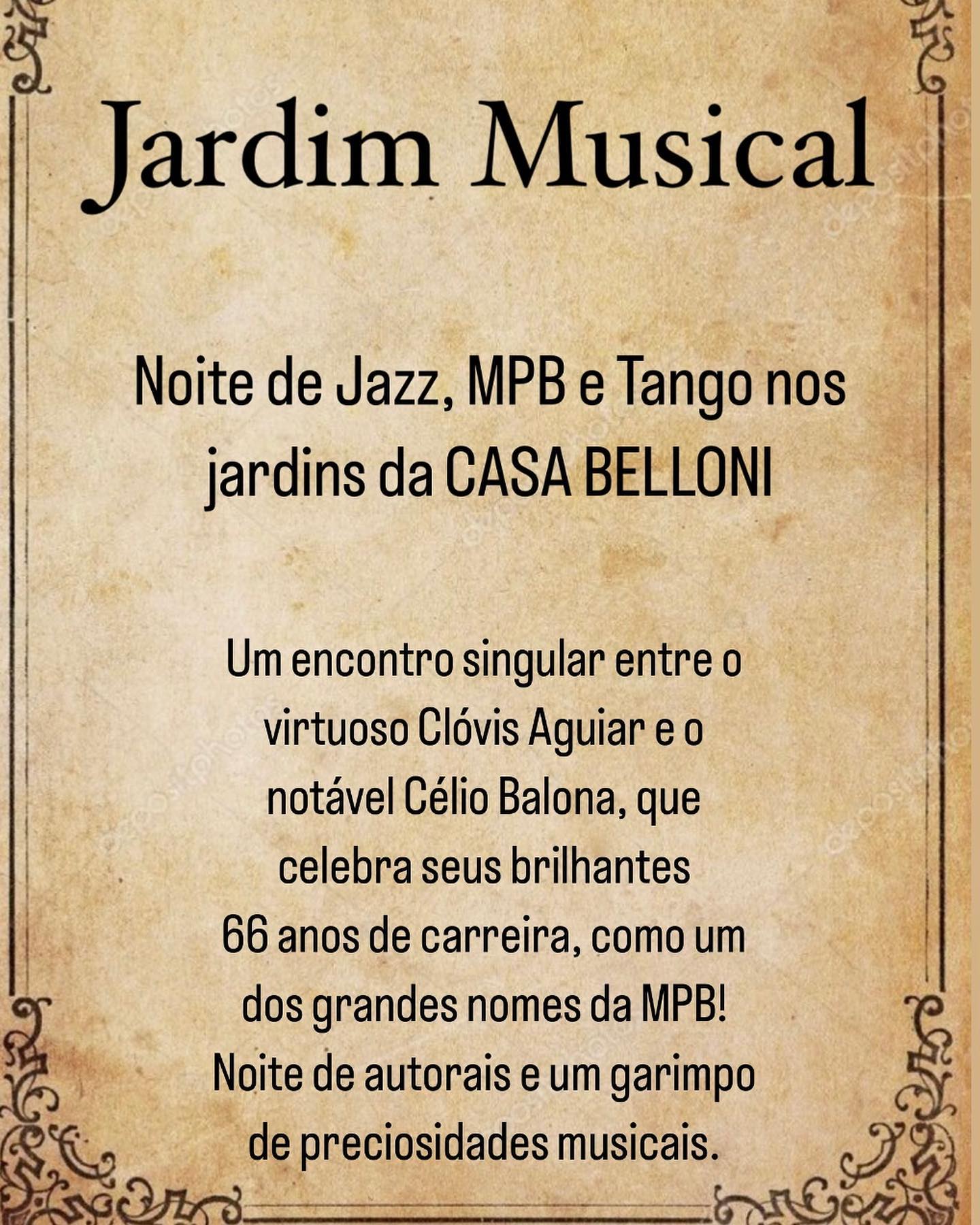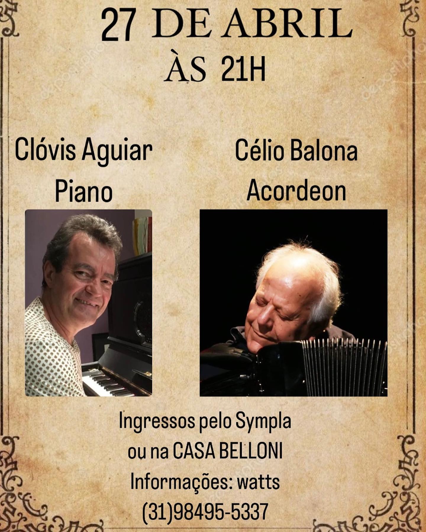 O Projeto Jardim Musical tem sua estreia, em grande estilo, no dia 27 de abril, quinta-feira, às 21h na Casa Belloni (Av. João Pinheiro, 287 - BH - MG), com um encontro singular entre o virtuoso pianista Clóvis Aguiar e o notável Célio Balona (acordeon) - que celebra 66 anos de carreira -, em noite de autorais e um garimpo de preciosidades musicais de MPB, Jazz e Tango. Repertório inédito.