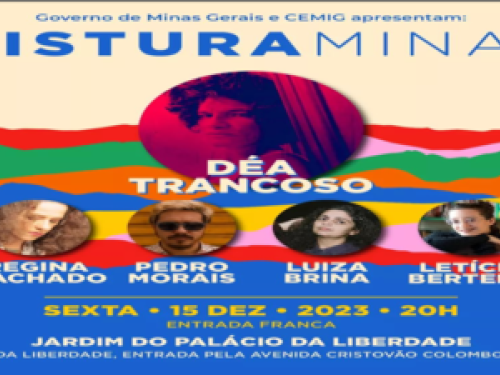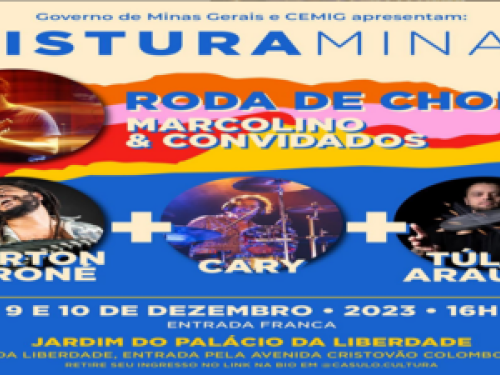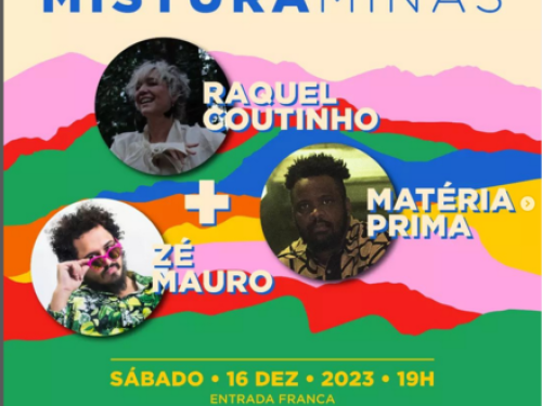 O projeto Mistura Minas, que acontece do dia 15 a 23 de dezembro, no Jardim do Palácio da Liberdade, com entrada gratuita, promove encontros inéditos entre artistas da música contemporânea e tradicional mineira, trazendo ao público a mescla da música popular, com o rap, jazz, samba, hip hop, pop, rock e folclórica.