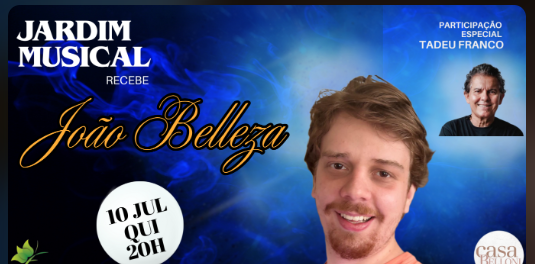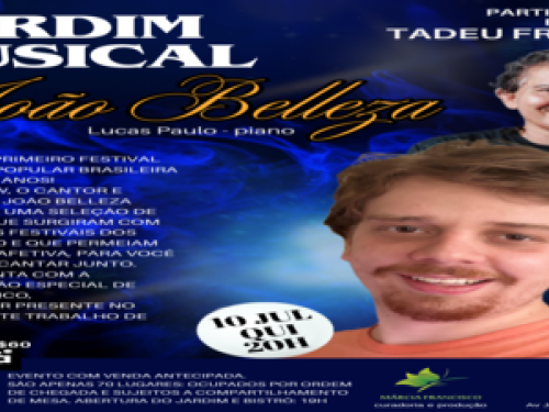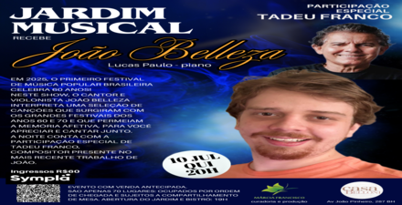 O Jardim Musical recebe o cantor e violonista João Belleza e seu convidado especial, Tadeu Franco, em show que recorda uma seleção de maravilhosas canções que surgiram com os grandes festivais.