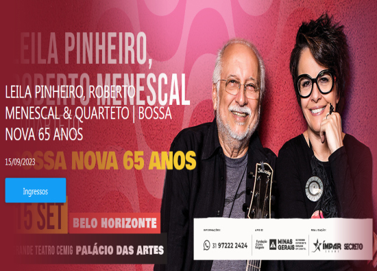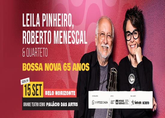 Os amigos e parceiros há muitos anos, Leila Pinheiro, Roberto Menescal & Quarteto, celebram juntos, em um show inédito, no palco do Grande Teatro do Palácio das Artes, no dia 15 de setembro, sexta-feira, às 21 horas, os 65 anos da bossa nova. Uma celebração à bossa, à Música e à amizade.