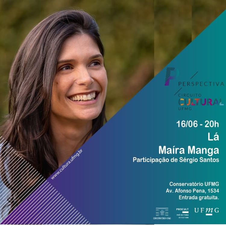 A cantora Maíra Manga se apresenta ao lado do compositor Sergio Santos canções do álbum “LÁ” no dia 16 de junho, sexta-feira às 20 horas, dentro do projeto Perspectiva – Circuito Cultural UFMG. Em formação intimista de violão e voz, Maíra e Sergio percorrerão o repertório do primeiro álbum da cantora, além de músicas já consagradas de Sergio e também canções que estarão presentes.