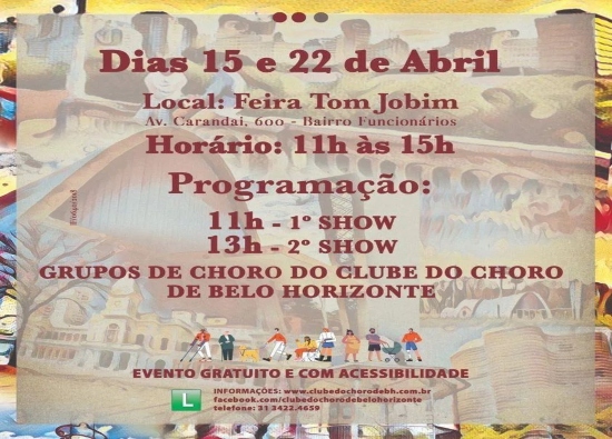 Para esta edição do CHORO DESTA CIDADE SOU EU – Clube do Choro de Belo Horizonte o público terá a oportunidade de assistir a 8 shows de diversas formações, da velha guarda até jovens instrumentistas, músicos profissionais e amadores e verá o encontro de gerações em nossas rodas de choro na FEIRA TOM JOBIM, sempre aos sábados de abril a partir das 11h.