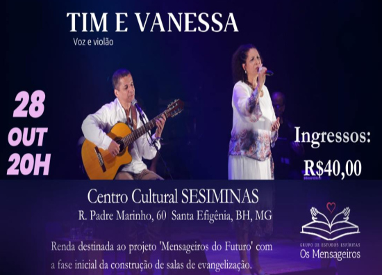 Com uma atmosfera íntima e acolhedora, o show proporcionará uma experiência musical única, conduzida pelos talentosos artistas Tim e Vanessa. "Tim e Vanessa, Voz e Violão" é um evento especialmente concebido para transmitir mensagens de paz, amor e reflexão através da música espírita.