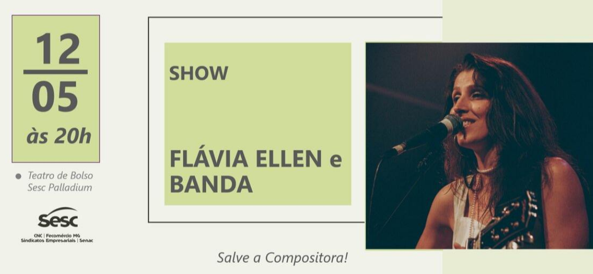 Natural de Belo Horizonte, Flávia Ellen é cantora, compositora e produtora cultural, uma das fundadoras do Sonora, maior festival de compositoras do mundo. Ela lançou seu primeiro EP autoral em 2015, o álbum completo “Desperta” em 2019, e o EP “Temporal” em 2021. Além disso, lançou os singles autorais “Filme de Amor” (2017) e “Um Pouquinho de Sal” (2020). Eu seu show, Flávia passeia pelos trabalhos autorais lançados em sua carreira e por algumas releituras da música brasileira na companhia de Léo Lana (bateria/percussão), Clayton Neri (guitarra/violão) e Raíssa Uchôa (baixo).