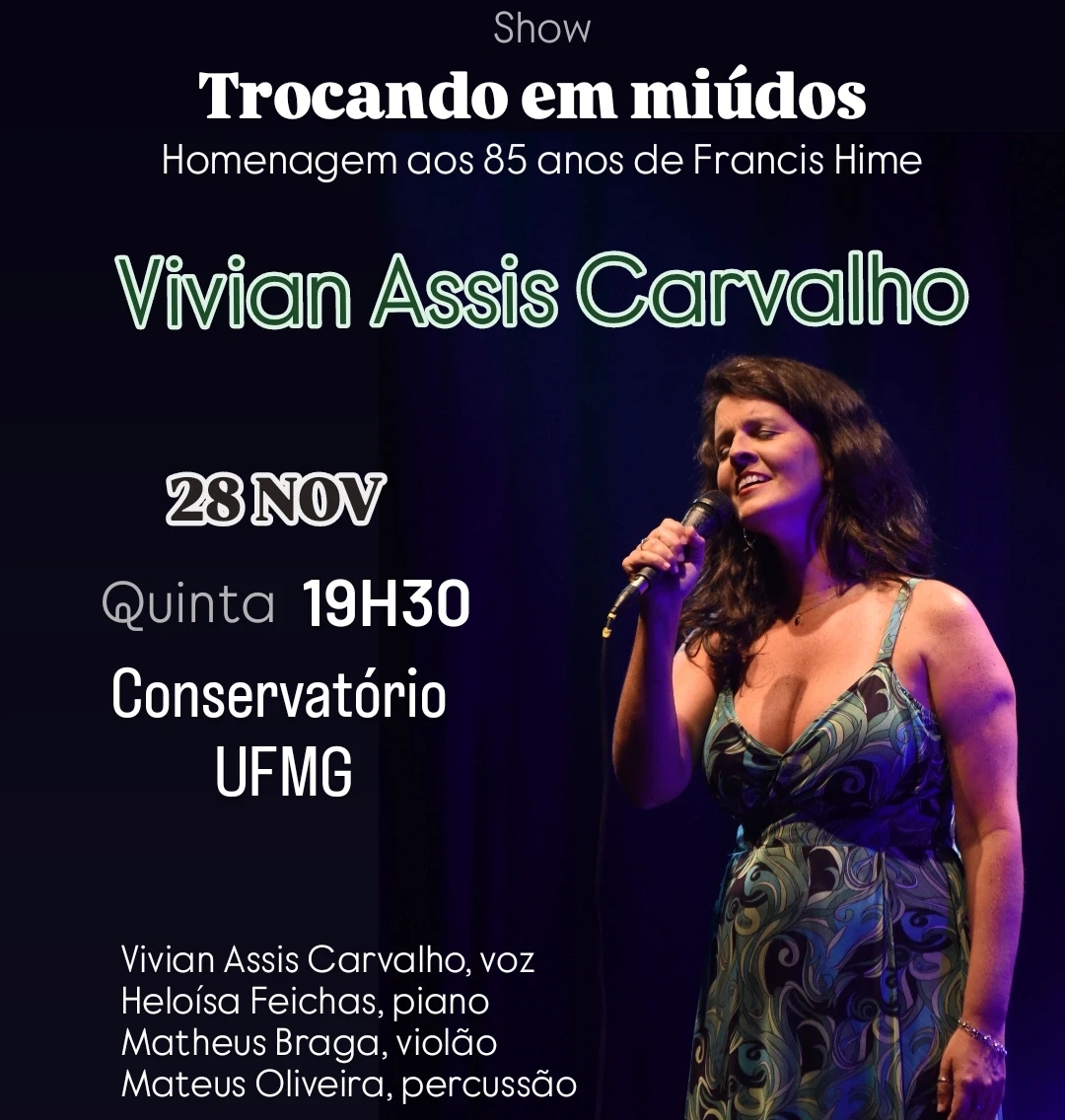 O Conservatório UFMG convida Vivian Assis Carvalho e Banda para a apresentação do show especial “Trocando em miúdos – Homenagem aos 85 anos de Francis Hime”.