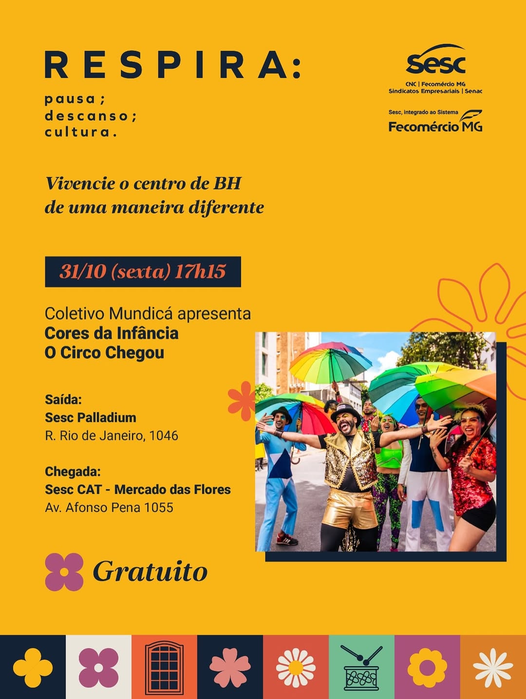 Neste 31 de outubro (sexta-feira), às 17h15, o artista Mar Sim vai conduzir um cortejo artístico, partindo do Sesc Palladium em direção ao Sesc CAT Mercado das Flores! A atividade é gratuita e contará com malabares, acrobacias e muito mais durante todo o percurso! É só chegar!