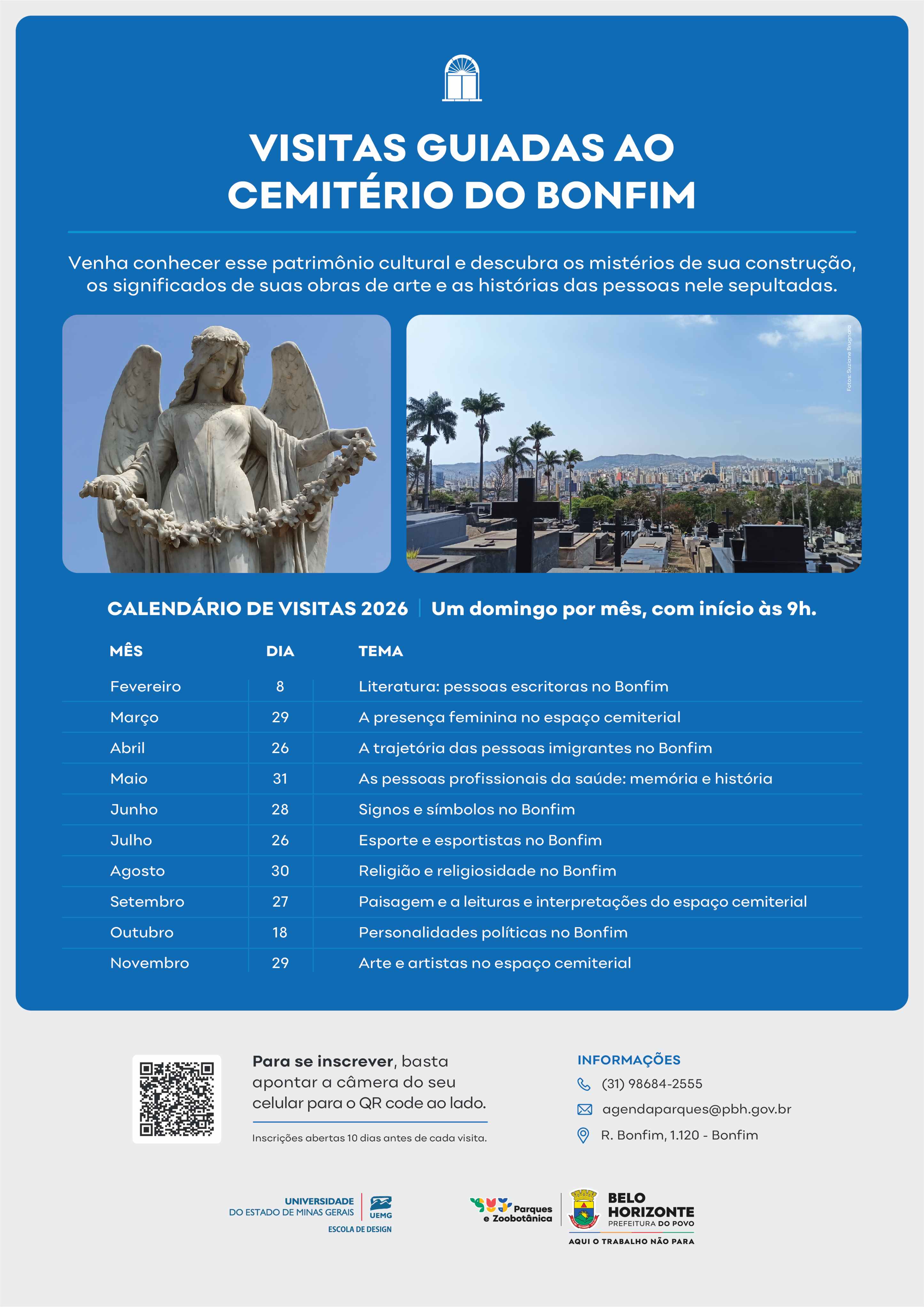 O Cemitério do Bonfim, necrópole mais antiga da cidade, tem a história contada através de diversificadas obras de arte. Apresentar toda essa riqueza é a proposta do Projeto “Visita Guiada ao Cemitério do Bonfim”, realizado desde 2012, por meio de parceria entre a Fundação de Parques Municipais e Zoobotânica e a Universidade do Estado de Minas Gerais (UEMG).