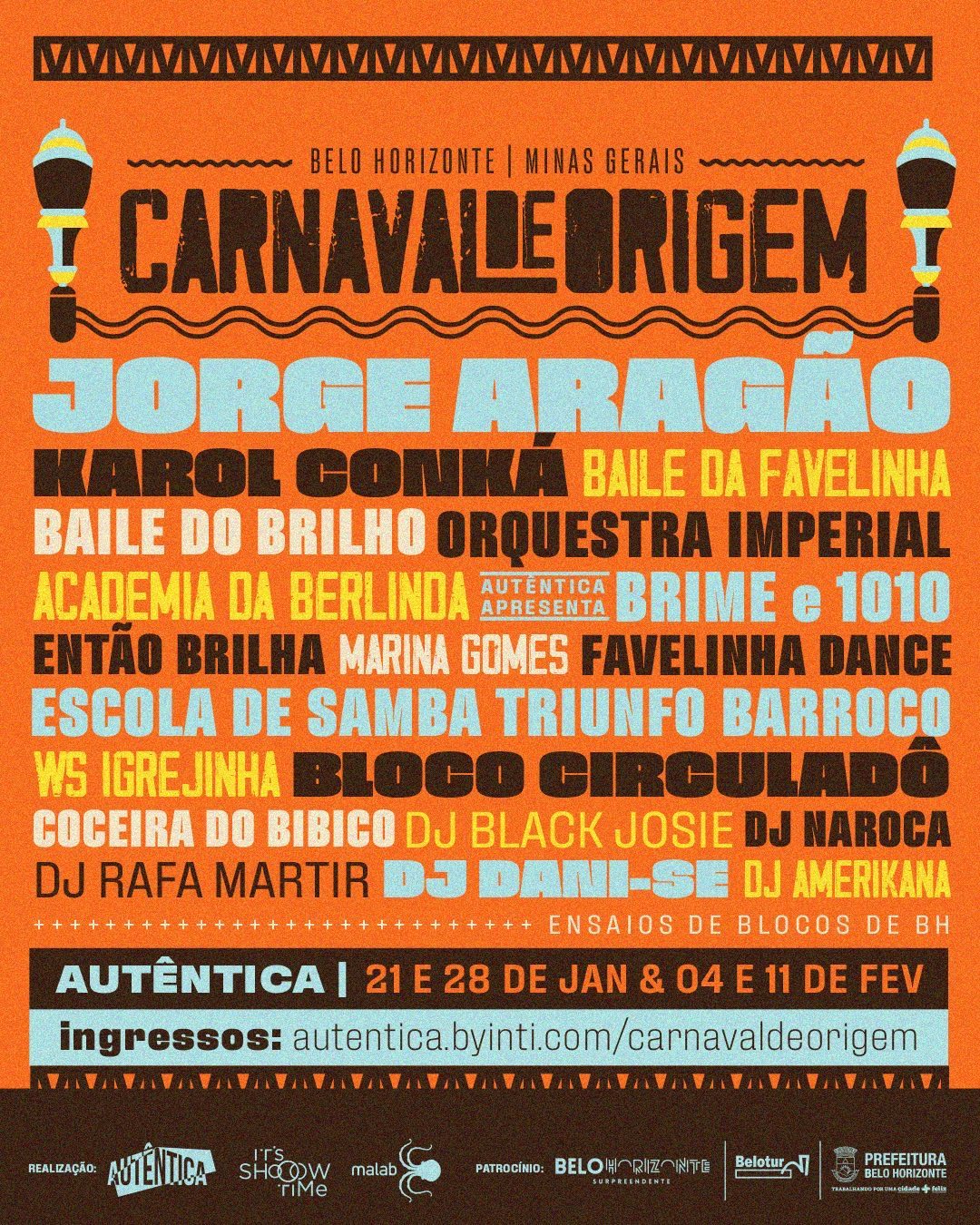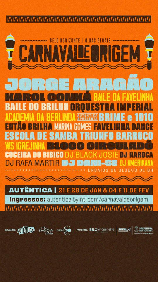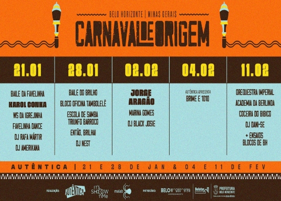 Festa, diversidade e encontros musicais, são as premissas do Carnaval de Origem, festival que vai tomar conta da programação da Autêntica nos dias 21 e 28 de janeiro, 2, 4 e 11 de fevereiro.