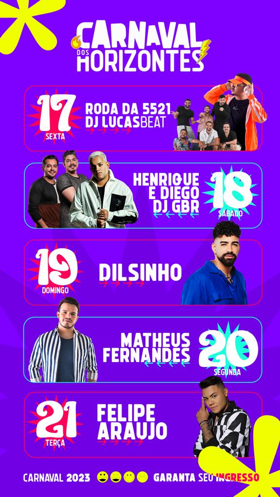 Na segunda de carnaval (dia 20) Matheus Fernandes, uma das grandes apostas do forró, combinando ritmos como sertanejo, piseiro e batidas eletrônicas, se apresenta no Carnaval dos Horizontes.
