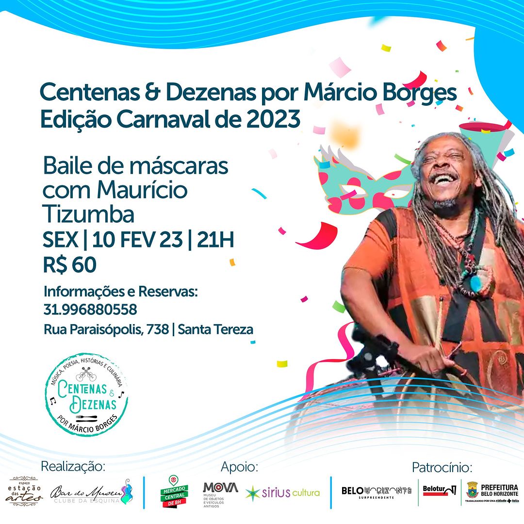 A programação do projeto “Centenas e Dezenas - por Marcio Borges - Carnaval 2023” começa no dia 10 de fevereiro com Baile de Máscaras e os tambores de Maurício Tizumba.