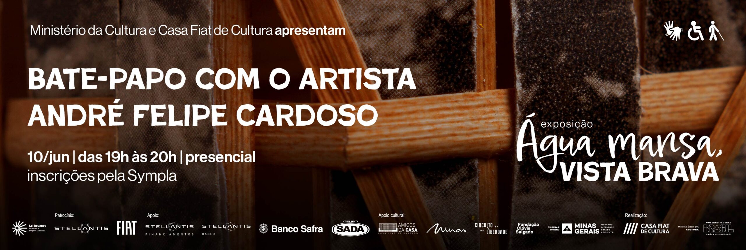 Na abertura da exposição “Água mansa, vista brava”, André vai contar sobre o seu processo de criação, inspirações e técnicas utilizadas, além de revelar suas pesquisas sobre o imaginário e suas memórias. Após o bate-papo, o artista conduzirá uma visita à exposição.