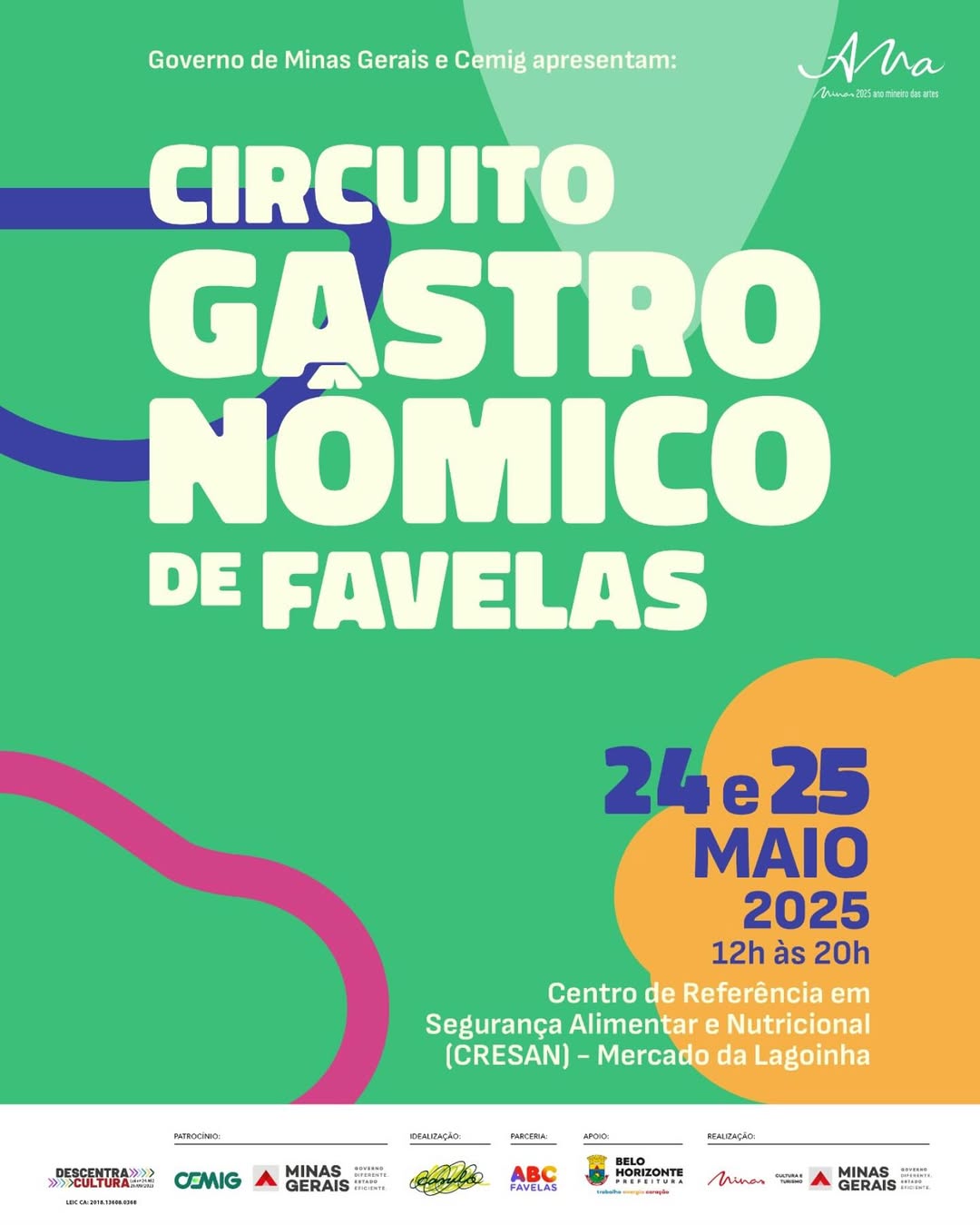 Nos dias 24 e 25 de maio acontece a oitava edição do Circuito Gastronômico de Favelas. O projeto, idealizado por Danusa Carvalho e realizado desde 2017, já movimentou diversas regiões de BH com foco na valorização da culinária periférica. Neste ano, a edição especial traz 10 cozinheiros e cozinheiras das favelas da cidade, oferecendo pratos que são suas especialidades, a maioria com receitas passadas por gerações. O evento também conta com apresentações musicais de Fabinho do Terreiro e Orquestra Cabaré, participação da chef Márcia Nunes (Dona Lucinha), da masterchef Bete Coutinho, e da quilombola Kriola Taty, premiada pela fundação Palmares. O Projeto Sopa de Pedra, do chef Américo Piacenza, está na programação e vai cozinhar e distribuir prato típico italiano.