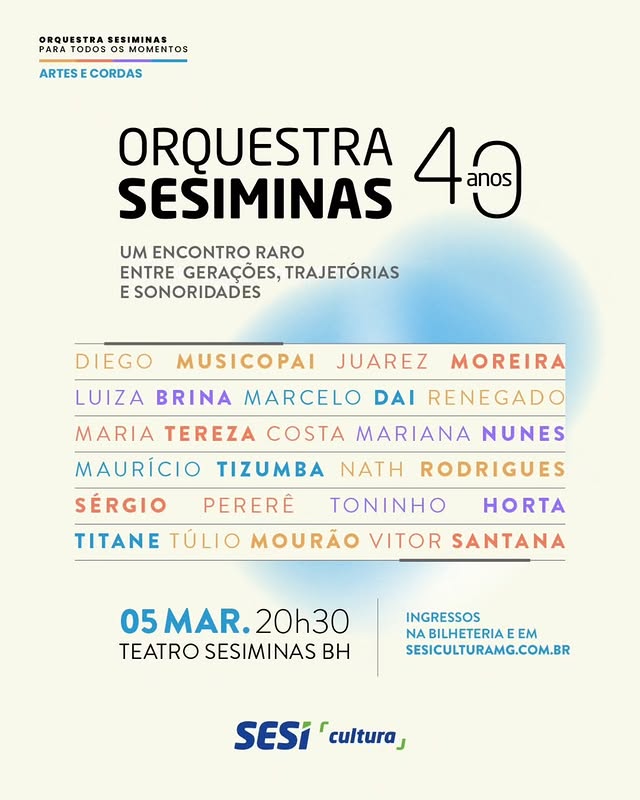 Para abrir a temporada dos 40 anos e da Série Artes e Cordas 2026, Belo Horizonte recebe um show especial com a participação de vários artistas mineiros que colaboraram ao longo de 40 anos de história. Grandes nomes como Maurício Tizumba, Renegado, Marcelo Dai, Vitor Santana, Sérgio Pererê, Mariana Nunes, Nath Rodrigues, Luiza Brina, Titane, Túlio Mourão, Juarez Moreira, Diego MusicoPai, Maria Tereza Costa e Toninho Horta; com participanção de dois maestros: Felipe Magalhães e Marco Antônio Drummond celebrando o início e o presente da orquestra. Você não vai ficar de fora dessa, vai?!