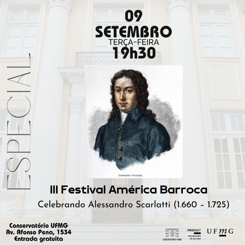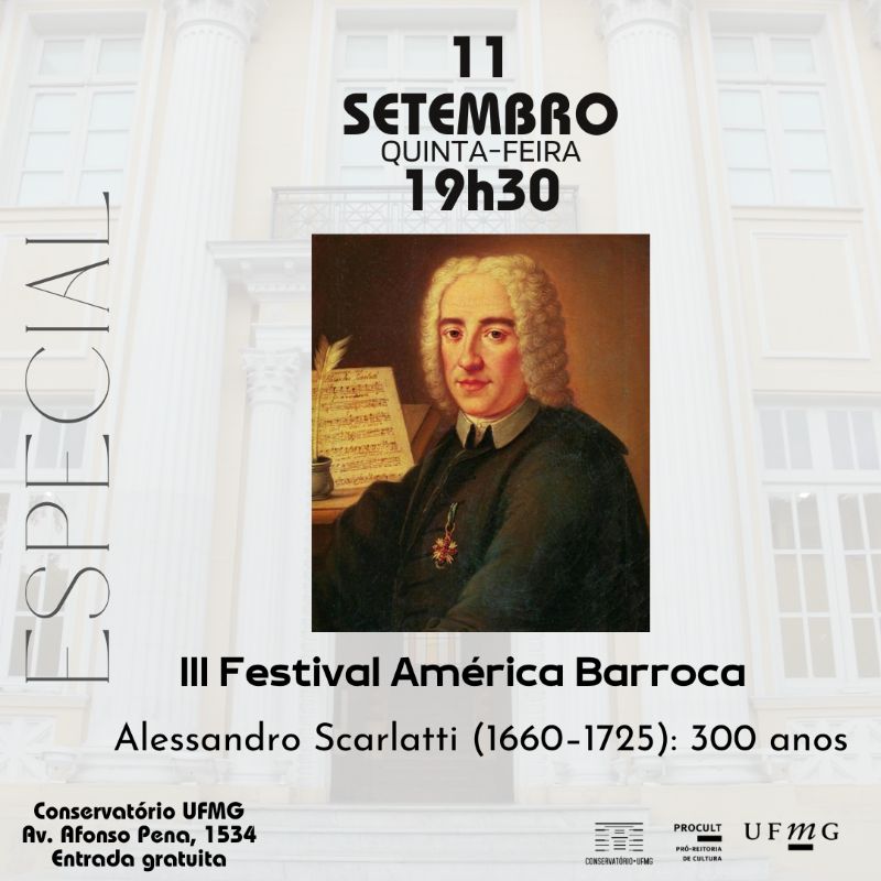Conservatório UFMG realiza o concerto “Celebrando Alessandro Scarlatti (1660 – 1725)” no dia 09 e 11 de setembro, às 19h30, o recital será dedicado aos 300 anos de morte do grande músico italiano. No programa, obras e sonatas de Alessandro Scarlatti, Domenico Scarlatti, Vivaldi, dentre outros importantes nomes do barroco mundial. O evento, aberto ao público, integra o III Festival América Barroca.