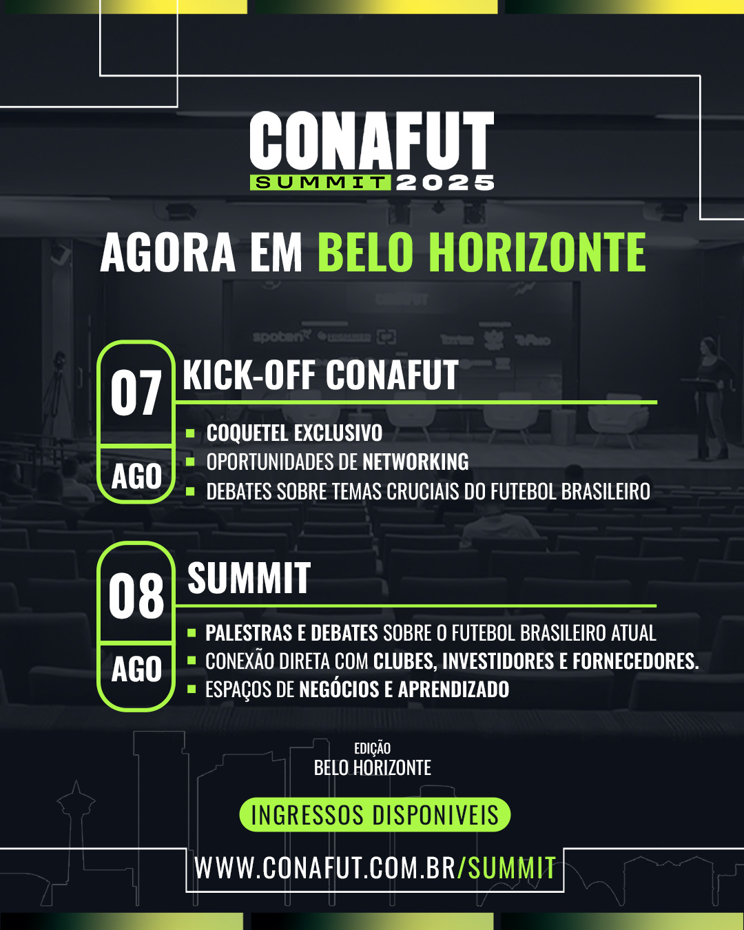 A I CONAFUT Summit será o ambiente ideal para conexões entre profissionais do futebol brasileiro. Em Belo Horizonte, acontecerá o encontro dos clubes, investidores e fornecedores do país.