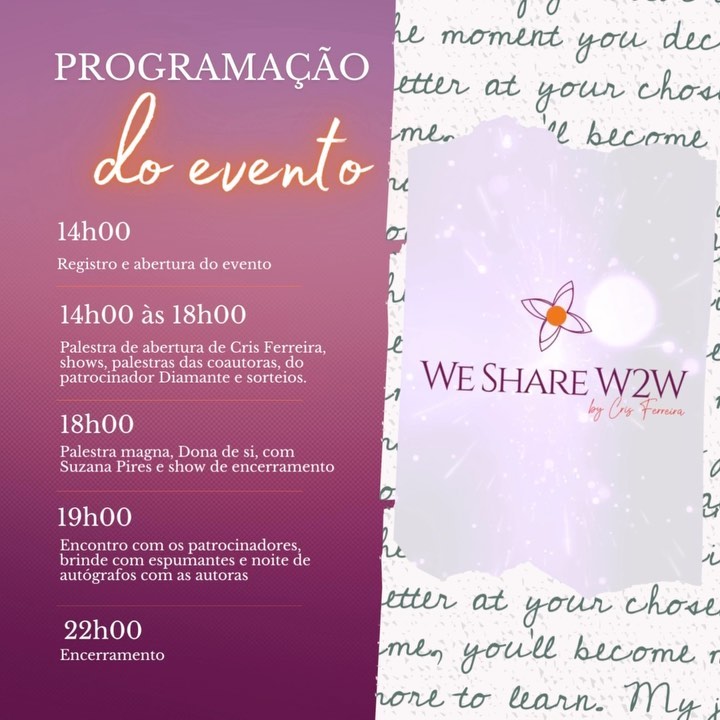 Um evento para impactar a sua vida com as palestras magnas de Cris Ferreira, idealizadora e fundadora do WeShareW2W e das empreendedoras coautoras do livro Agora é com elas
