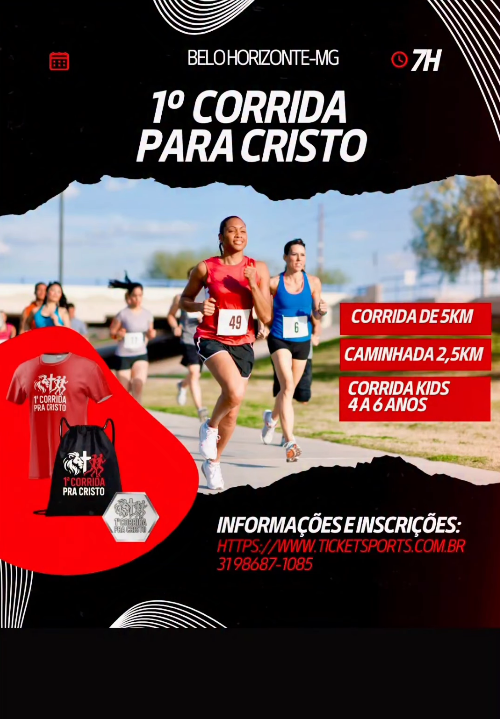 No dia 25 de outubro de 2025, será realizada a 1ª Corrida Pra Cristo — um evento esportivo e solidário que une esporte, espiritualidade e amor ao próximo. Reúna sua família e amigos para uma manhã de muita energia, fé e movimento!