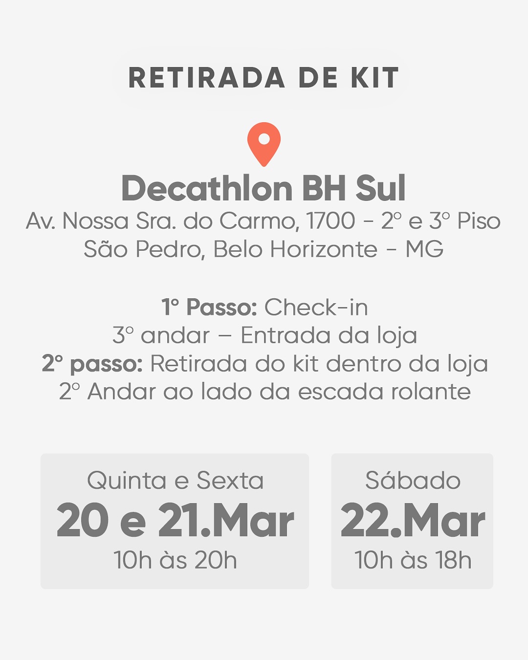 Local: Decathlon BH Sul - Avenida Nossa Senhora do Carmo, 1.700 - 2º e 3º pisos - São Pedro