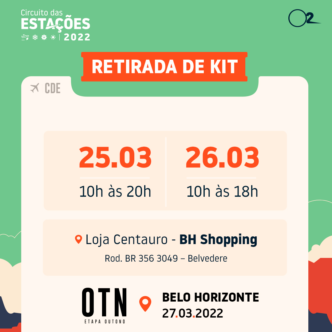 O Circuito das Estações é o maior Circuito de corridas da América Latina e é o principal responsável por despertar o corredor dentro de cada um. São 4 etapas, cada uma representando uma estação do ano. Em 2022, anunciamos a todos os passageiros que o nosso voo CDE22 com destino final ao Verão está autorizado. Nosso tempo de voo está estimado em 625 horas, e nossas escalas são: OTN, INV, PMV e VRO. Tenhamos todos uma ótima viagem!