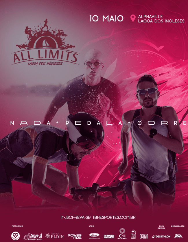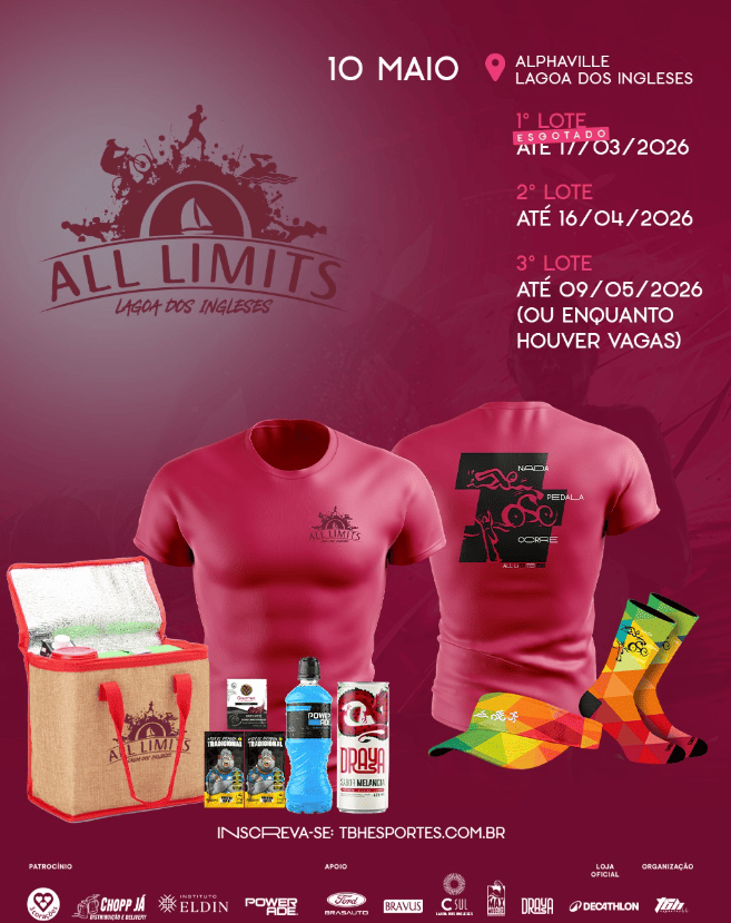 O Festival Esportivo ALL LIMITS – Lagoa dos Ingleses acontece no dia 10 de maio de 2026, no Alphaville Lagoa dos Ingleses, em Nova Lima, reunindo atletas em uma proposta que integra diferentes modalidades esportivas em um mesmo cenário.