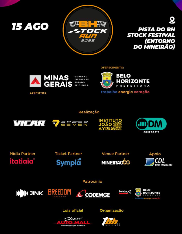 O Evento Esportivo "BH STOCK RUN 2025", doravante denominada EVENTO, será realizado dentro na Pista do BH Stock Festival que será utilizada pelos carros da Stock Car (Entorno do Mineirão) e imediações, em Belo Horizonte, no dia 15 de AGOSTO de 2025, em qualquer condição climática, com participação de pessoas, homens ou mulheres devidamente inscritas, doravante denominadas ATLETAS.