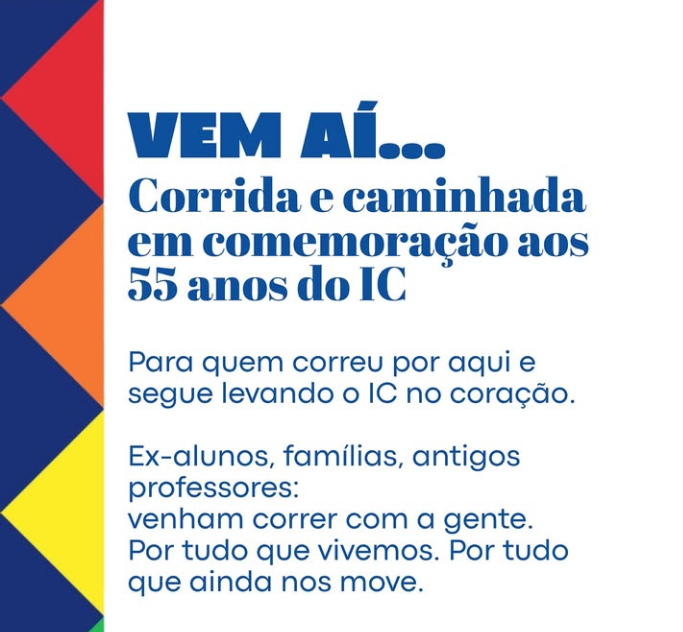 A largada será no IC e o percurso já está disponível em nosso site, com uma manhã inteira de reencontros, atividades para crianças, espaço de convivência e muitas surpresas. Uma verdadeira celebração dos vínculos criados ao longo de 55 anos. Porque tem um pedaço do IC em cada pessoa que passou por aqui. E agora é hora de reencontrar esse pedaço — com o corpo, com o coração e com aqueles que caminharam com a gente.