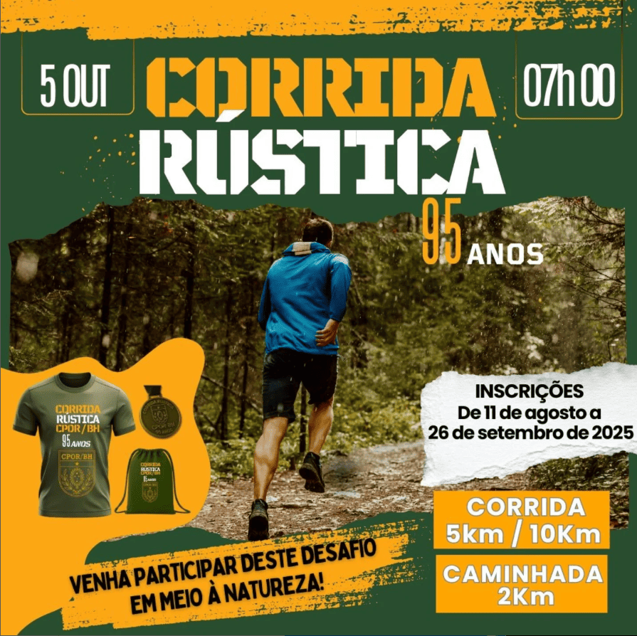 Participe da 1ª Edição da Corrida Rústica do CPOR/BH, em comemoração aos 95 anos da instituição, que ocorrerá no dia 5 de outubro de 2025, em Belo Horizonte. Com largada às 07:00h, o evento contará com percursos de 5 km e 10 km para corridas, além de uma caminhada de 2 km. O CPOR/BH será o cenário ideal para essa celebração, que promete não apenas competição, mas também diversão para toda a família, com apresentações musicais, food trucks e um espaço kids com atividades para as crianças. Todos os participantes receberão medalhas de participação, enquanto os vencedores das categorias terão a chance de conquistar troféus. Não perca a oportunidade de vivenciar um dia de esporte e confraternização, celebrando os valores do Exército Brasileiro! Inscreva-se já e garanta seu kit de participação!