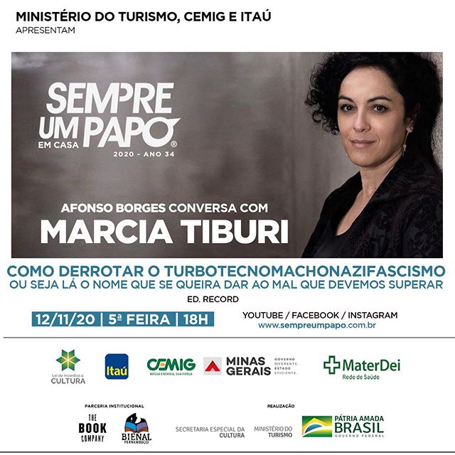 A filósofa Marcia Tiburi é a convidada de Afonso Borges para o debate e o lançamento do livro “Como Derrotar o Turbotecnomachonazifascismo - ou seja lá o nome que se queira dar ao mal que devemos superar ” (Ed.Record), em mais uma edição virtual do #SempreUmPapoEmCasa, com transmissão ao vivo no Youtube, Instagram e Facebook do Projeto.
