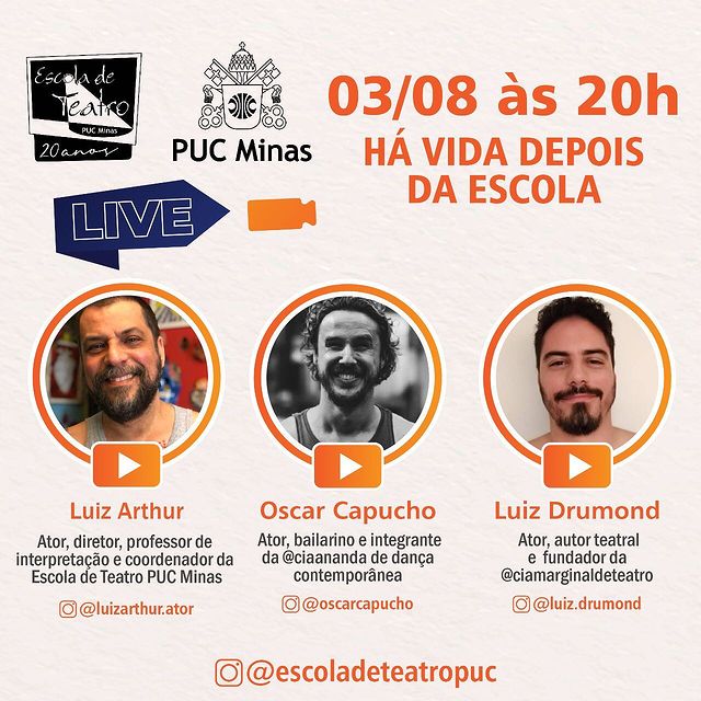 A segunda live terá como convidados os atores Luiz Drumond e Oscar Capucho. No bate-papo com o coordenador da Escola, professor Luiz Arthur, lembranças de suas passagens pela Escola de Teatro PUC Mina, como seguem enfrentando os desafios do mercado profissional e muito mais.