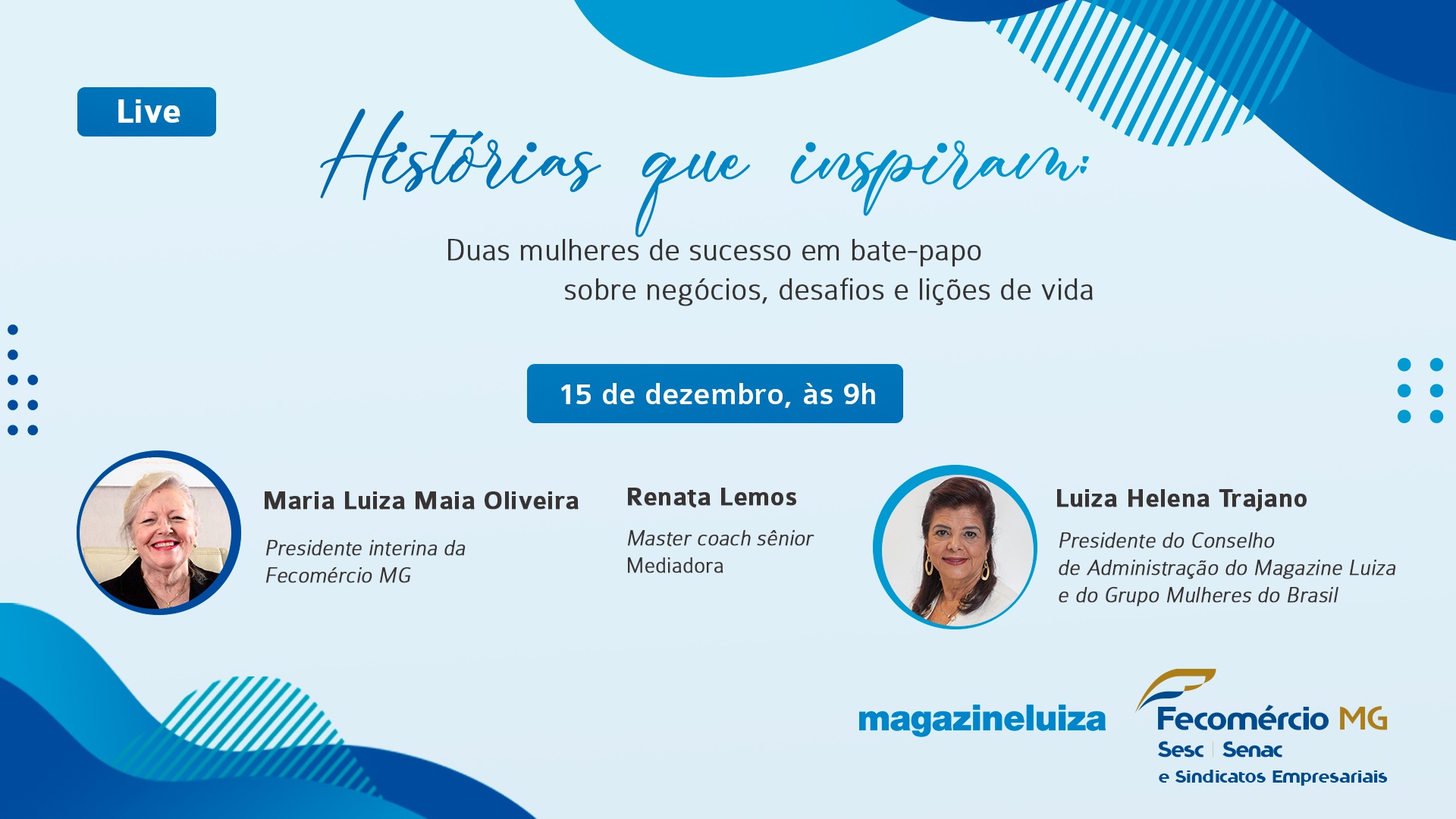 A postura firme, dinâmica e cuidadosa são alguns atributos comuns a milhares dessas profissionais. Não por acaso, a liderança com foco em resultados positivos e a valorização de pessoas são premissas seguidas pela presidente interina da Fecomércio MG, Maria Luiza Maia Oliveira, e pela presidente do Conselho de Administração do Magazine Luiza e do Grupo Mulheres do Brasil, Luiza Helena Trajano. Com o intuito de promover um bate-papo entre as ‘Luizas’, duas presidentes e empreendedoras de sucesso, o projeto “Fecomércio em Conexão” realizará uma live especial no dia 15 de dezembro, às 9h.