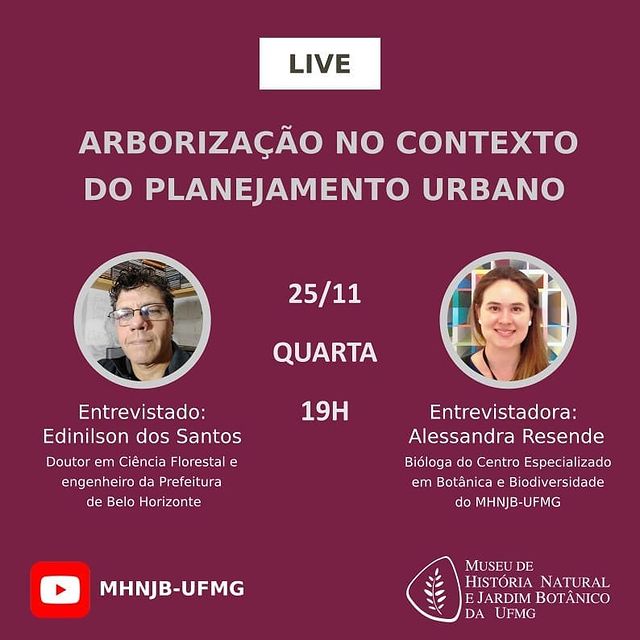 No dia 25 de novembro, às 19h, o Museu de História Natural e Jardim Botânico da UFMG promove a live “Arborização no Contexto do Planejamento Urbano”.