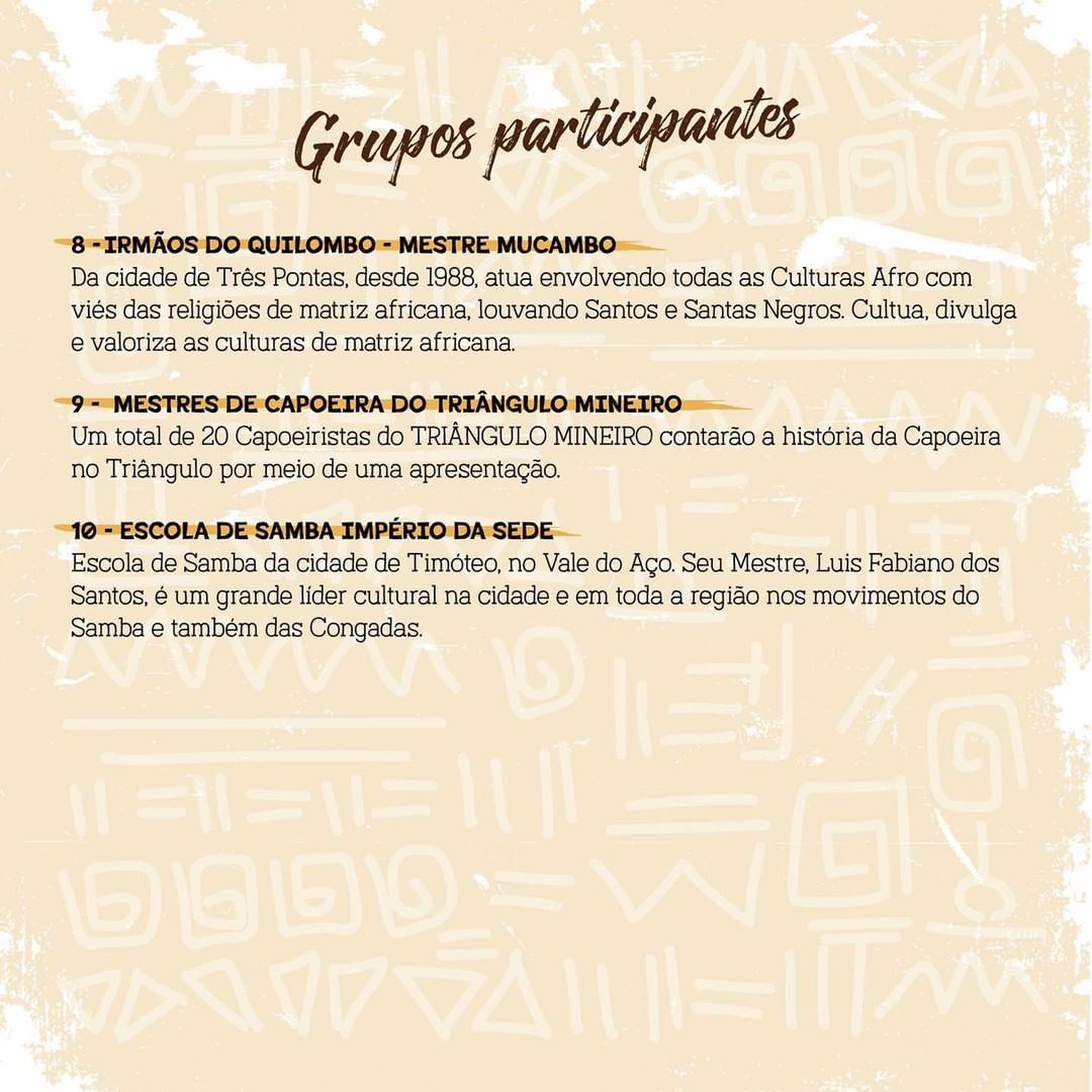 Serão feitas apresentações artísticas de Grupos de Congado, Capoeira, Terreiros, Samba, Batuque e Hip Hop, entre outros.