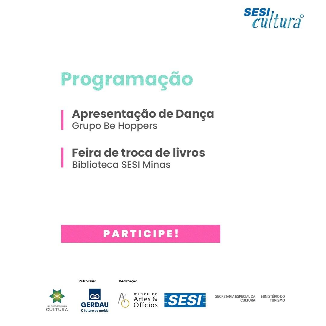Durante o período terá também uma apresentação de dança com o grupo Be Hoppers e uma feira de troca de livros da Biblioteca do Sesiminas, em um ponto volante do Sesi Cultura na Praça da Estação.