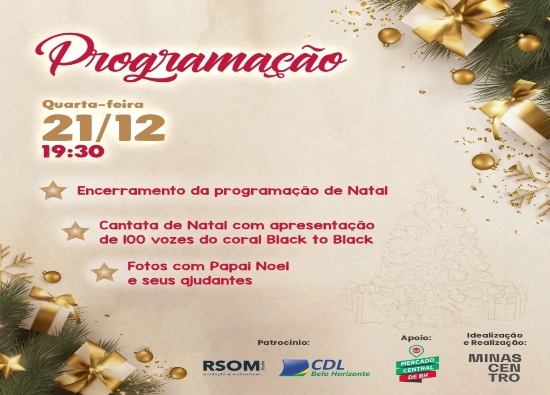 Programação: Encerramento com Cantata de Natal com a apresentação do coral Black to Black, fotos com o Papai Noel e personagens. Grátis