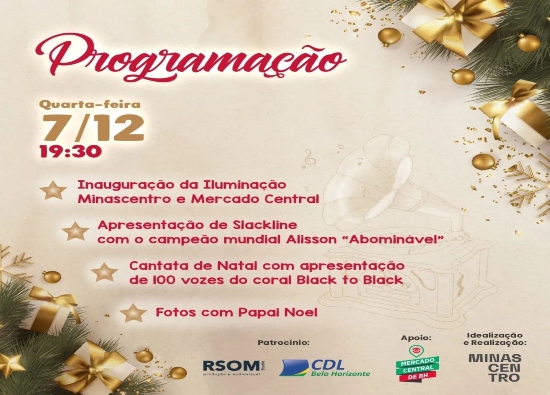 Programação: Inauguração da iluminação da fachada; Cantata com a apresentação do coral Black to Black; apresentação de slackline e a chegada do Papai Noel. Grátis