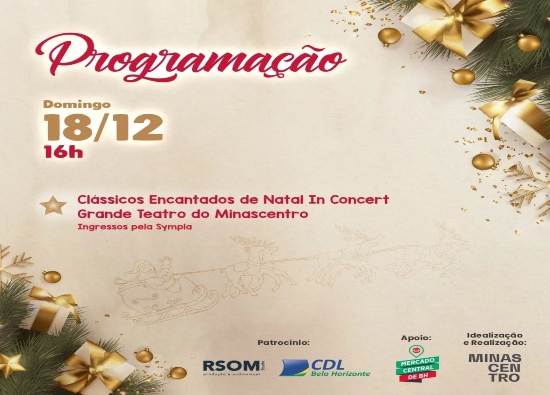 Programação: Apresentação da peça Clássicos de Natal, com orquestra, balé, efeitos de luz e projeção mapeada, que encanta e emociona espectadores de todas as idades. Todo o show 100% cantado ao vivo. Os ingressos variam entre R$55,00 a R$150,00 e podem ser adquiridos pela Sympla.