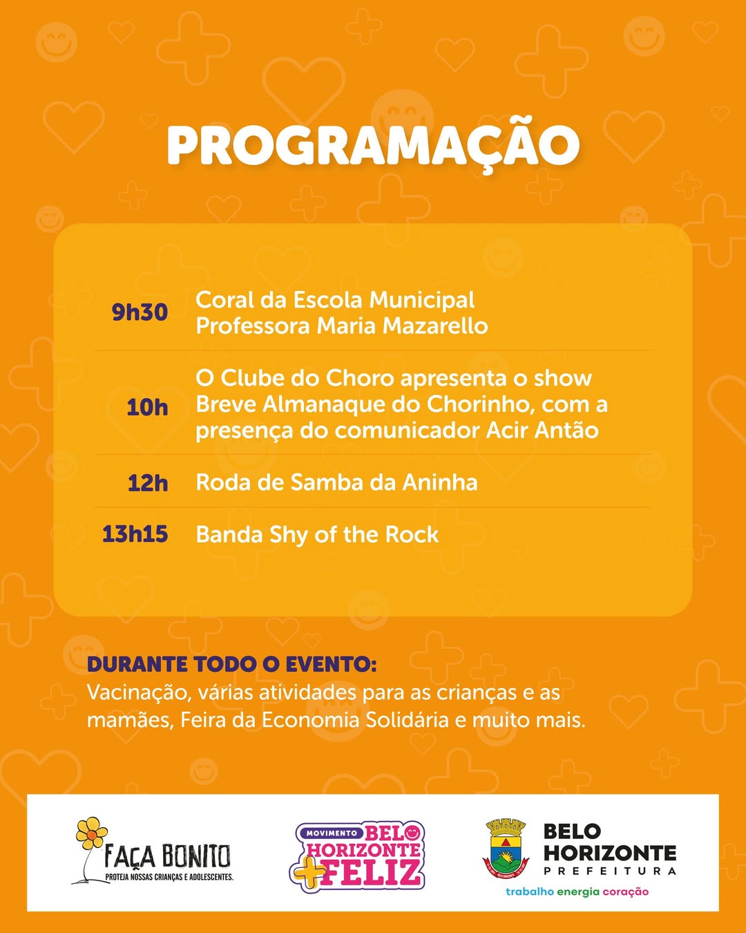 Em apoio ao Dia D de Vacinação, à campanha do Maio Laranja - Contra a Exploração Sexual de Crianças e Adolescentes -, e em homenagem ao Dia das Mães, o BH Mais Feliz preparou uma programação muito bacana no coração da cidade: