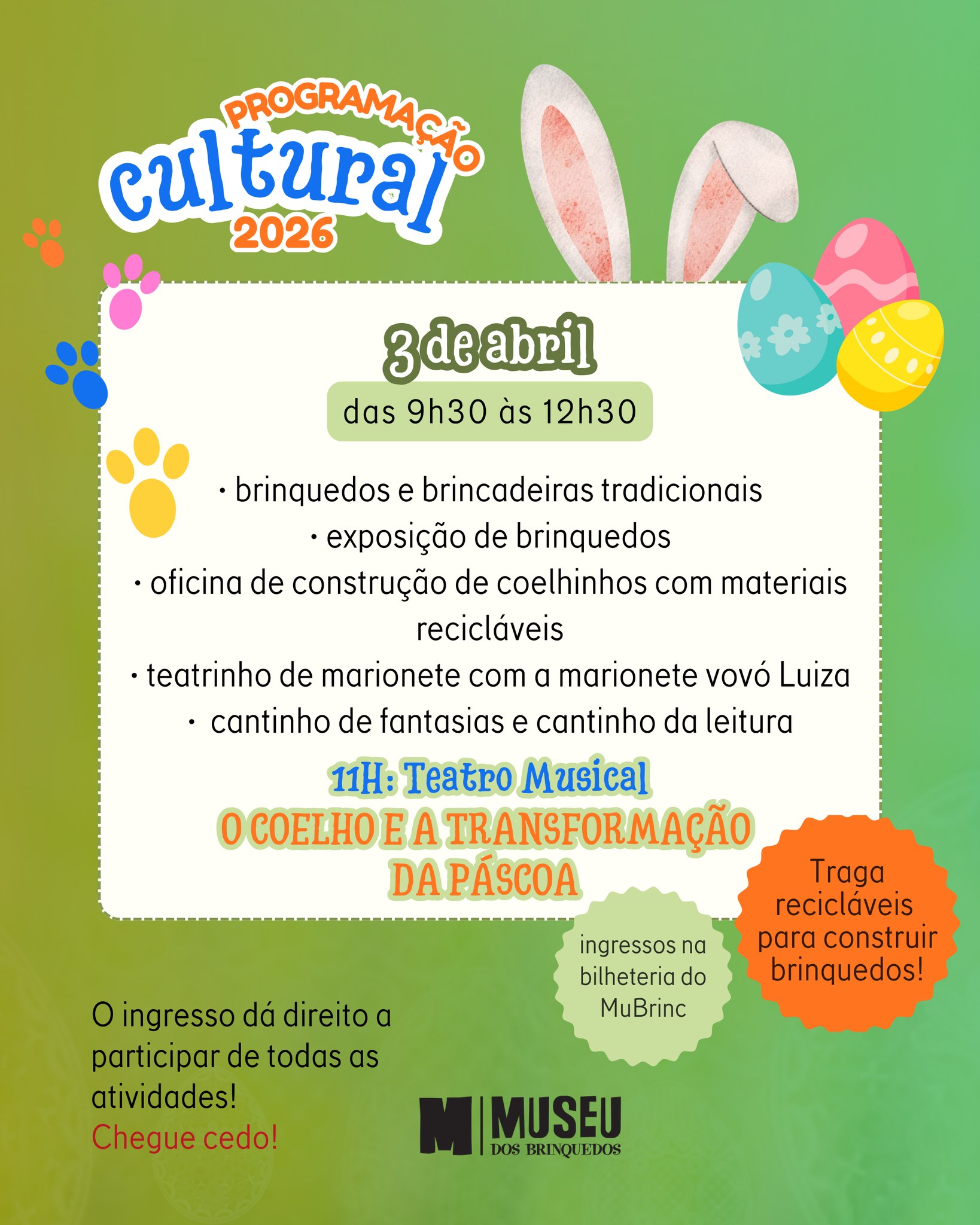 ATIVIDADES NOS 3 DIAS AO LONGO DOS DOIS TURNOS (9h30 às 12h30 ou 14h às 17h) : oficina de construção de coelhinhos com materiais recicláveis, teatro de marionete da Vovó Luzia, exposição de brinquedos e brincadeiras de quintal, realizadas ao longo da programação.