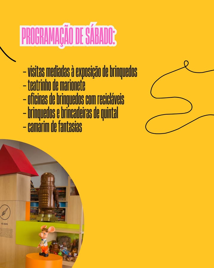 Além da oficina, a programação inclui visita à exposição, teatrinho de marionetes, brincadeiras tradicionais e cantinho da leitura, transformando o museu em um espaço de convivência, cultura da infância e imaginação.