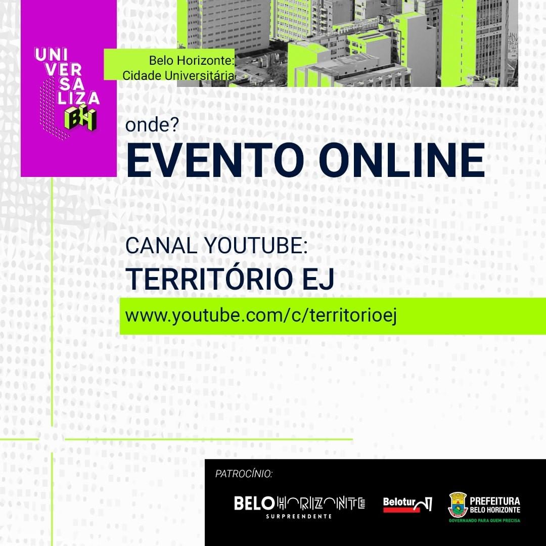 Em atenção às medidas de isolamento social, o evento Universaliza BH será totalmente online e gratuito, sendo transmitido via YouTube, no canal da Território EJ (Empresa Júnior de Turismo da UFMG), empresa parceira do evento.