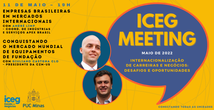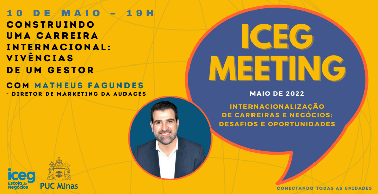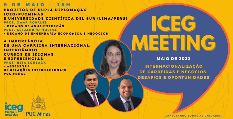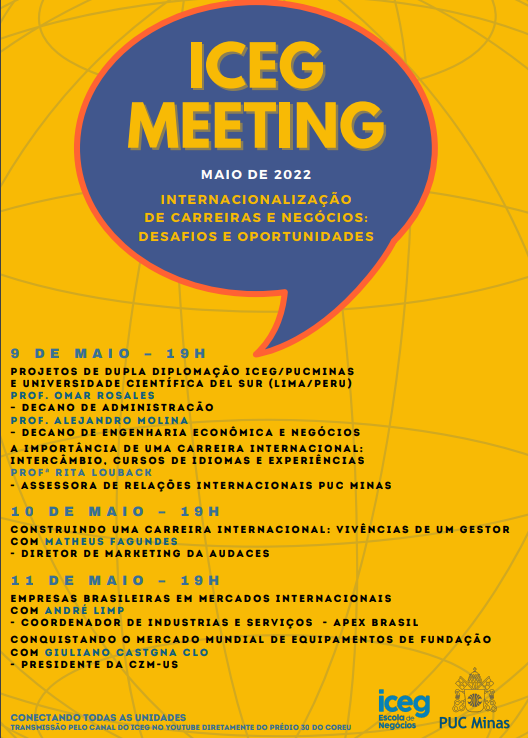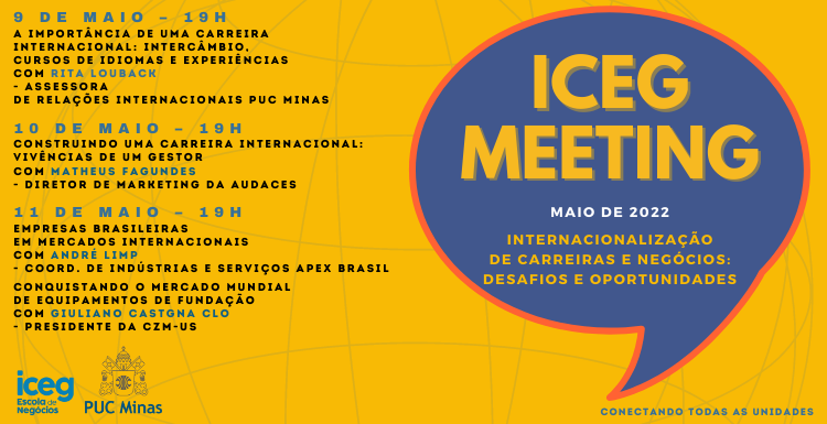 O evento Iceg Meeting, criado para tratar sobre a internacionalização de carreiras e negócios, pela Escola de Negócios - Instituto Ciências Econômicas e Gerenciais (Iceg), acontecerá de segunda a quarta-feira, 9 a 11 de maio, no Teatro João Paulo II (prédio 30), Campus Coração Eucarístico. A atividade será transmitida pelo canal do Iceg no Youtube, aberta a todos os alunos do Instituto.