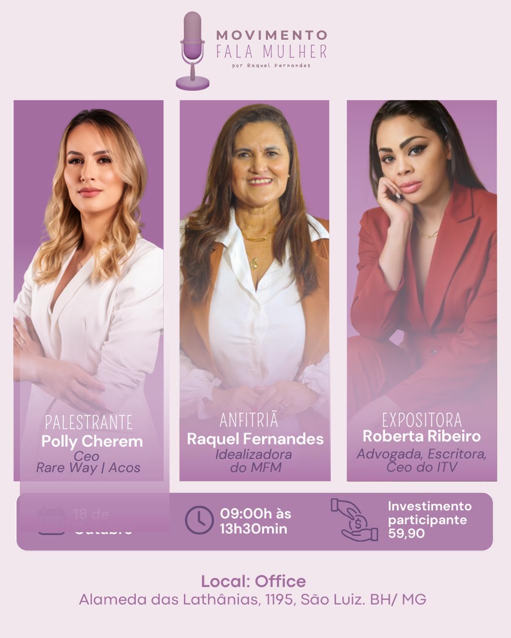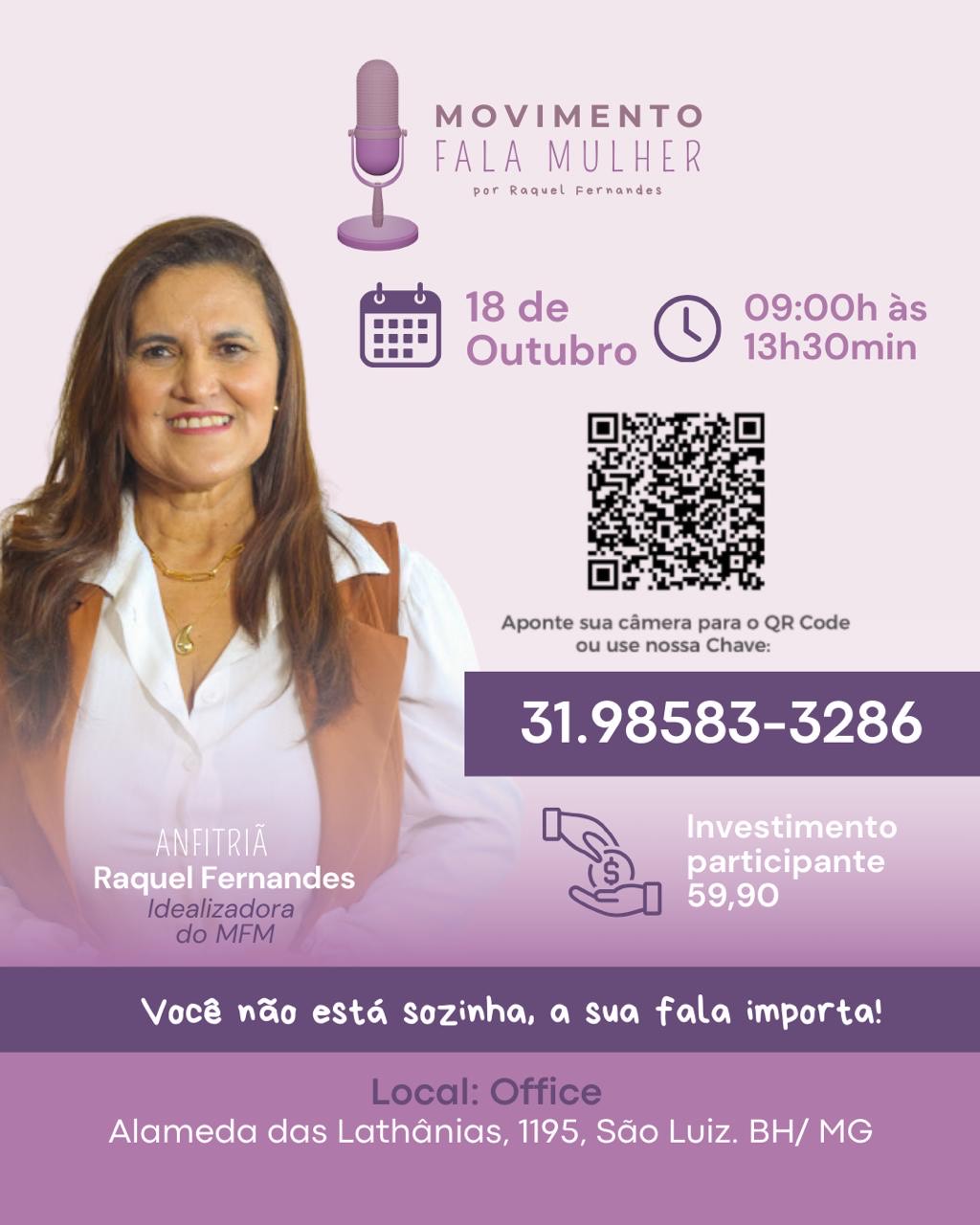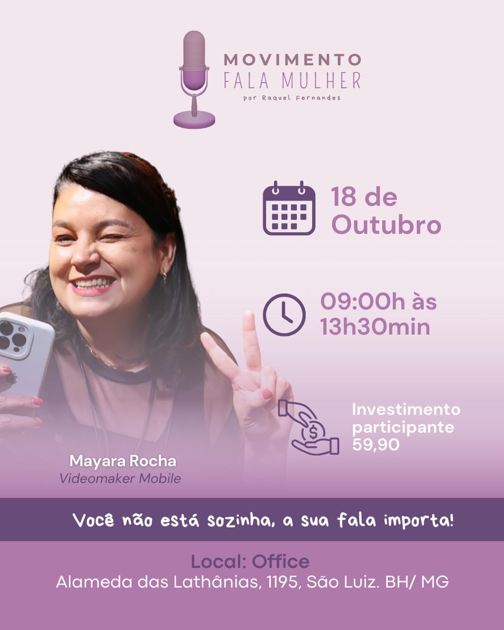 Após o grande sucesso da primeira edição, o Movimento Fala Mulher já tem data marcada para o seu próximo encontro: dia 18 de outubro, das 9h às 13h30, no Office – Alameda das Lathânias, 1195, São Luiz, em Belo Horizonte.