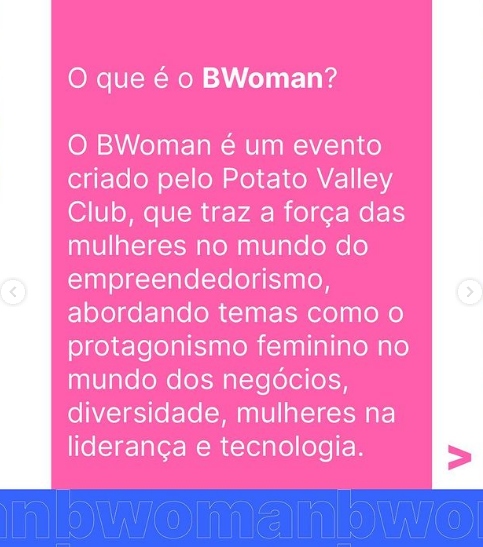 Para quem ainda não conhece, o BWoman é um evento criado pelo @potatovalleyclub_ @bhub.ai - que traz a força das mulheres no mundo do empreendedorismo, abordando temas como o protagonismo feminino no mundo dos negócios, diversidade, mulheres na liderança e saúde mental.