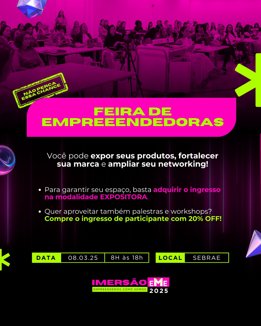 Com o objetivo de fomentar o empreendedorismo feminino, o evento contará também com uma feira aberta ao público. Formada por expositoras de diversos segmentos, ela é uma excelente oportunidade de divulgar seus produtos ou serviços, fortalecer sua marca e aumentar seu networking.